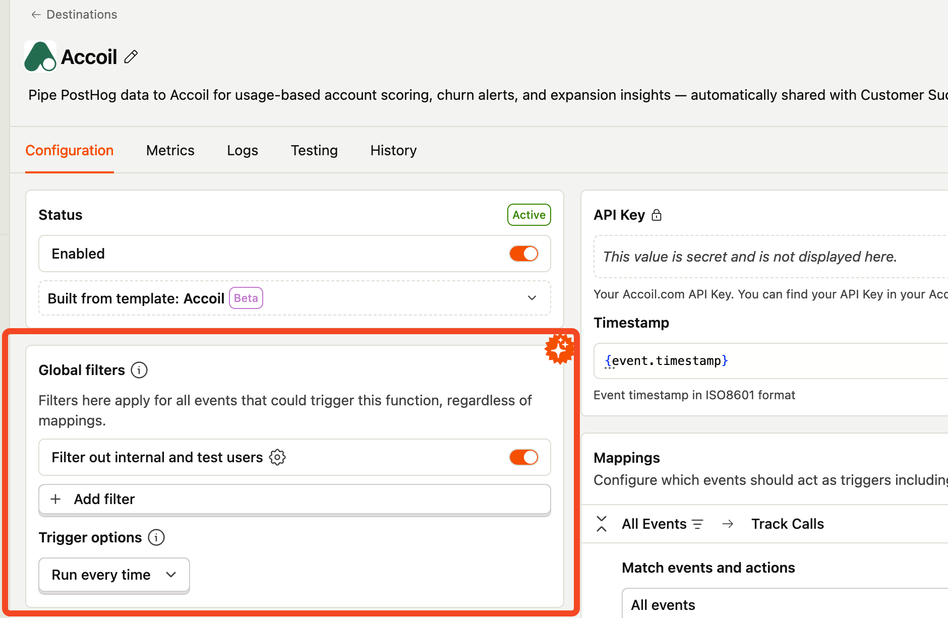 These approaches approach keeps test data from ever reaching Accoil. You can configure filtering directly within your PostHog setup: